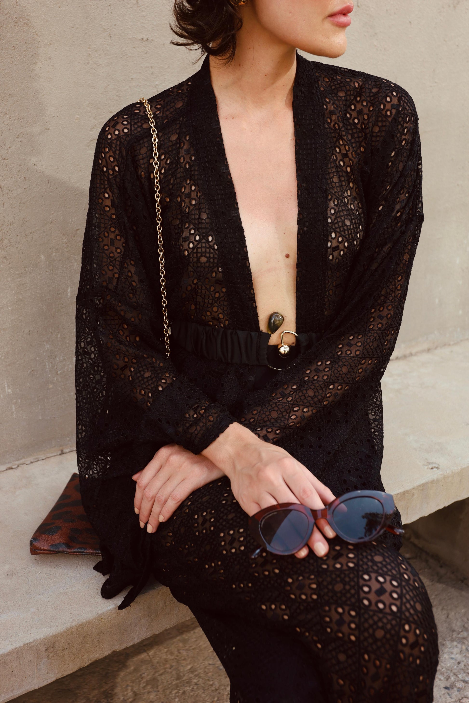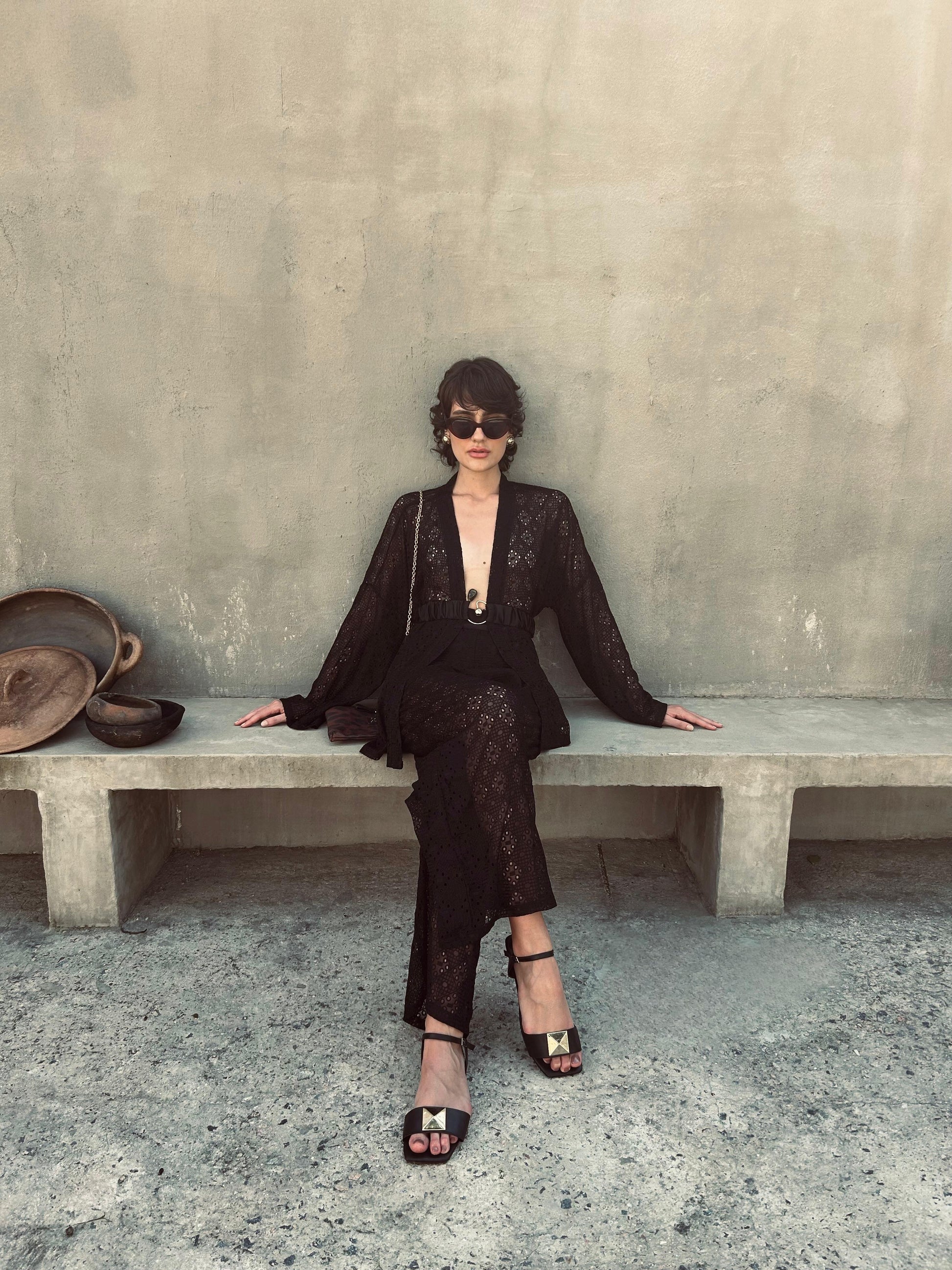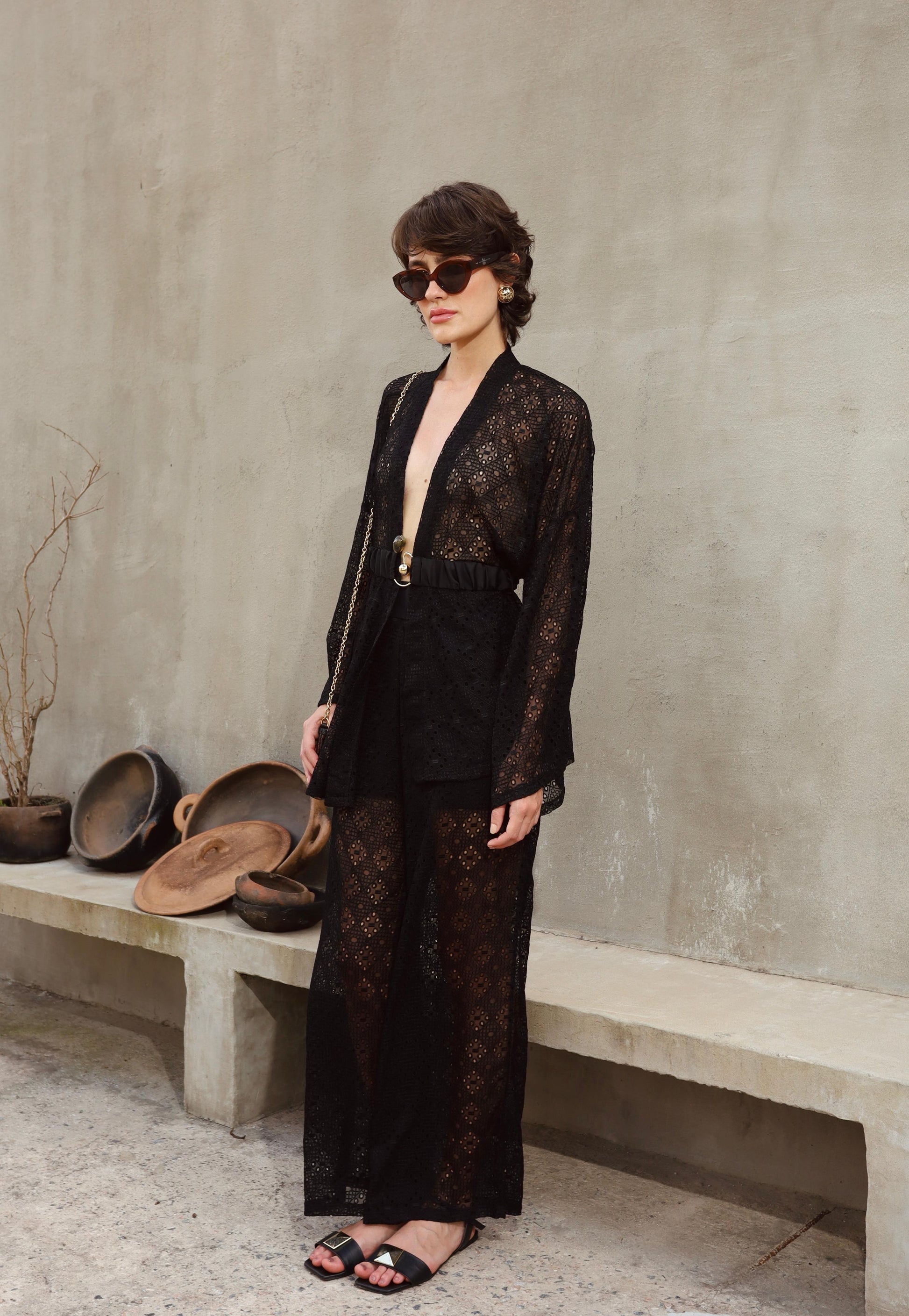 O Conjunto Sicília reúne sofisticação e estilo, composto por calça wide leg e kimono em renda de seda pura nas cores off white e preto. Acompanha cinto elástico com detalhe em aço inoxidável e uma pedra elegante, adicionando um toque refinado ao visual. Perfeito para quem busca um look distinguido com conforto e design contemporâneo.