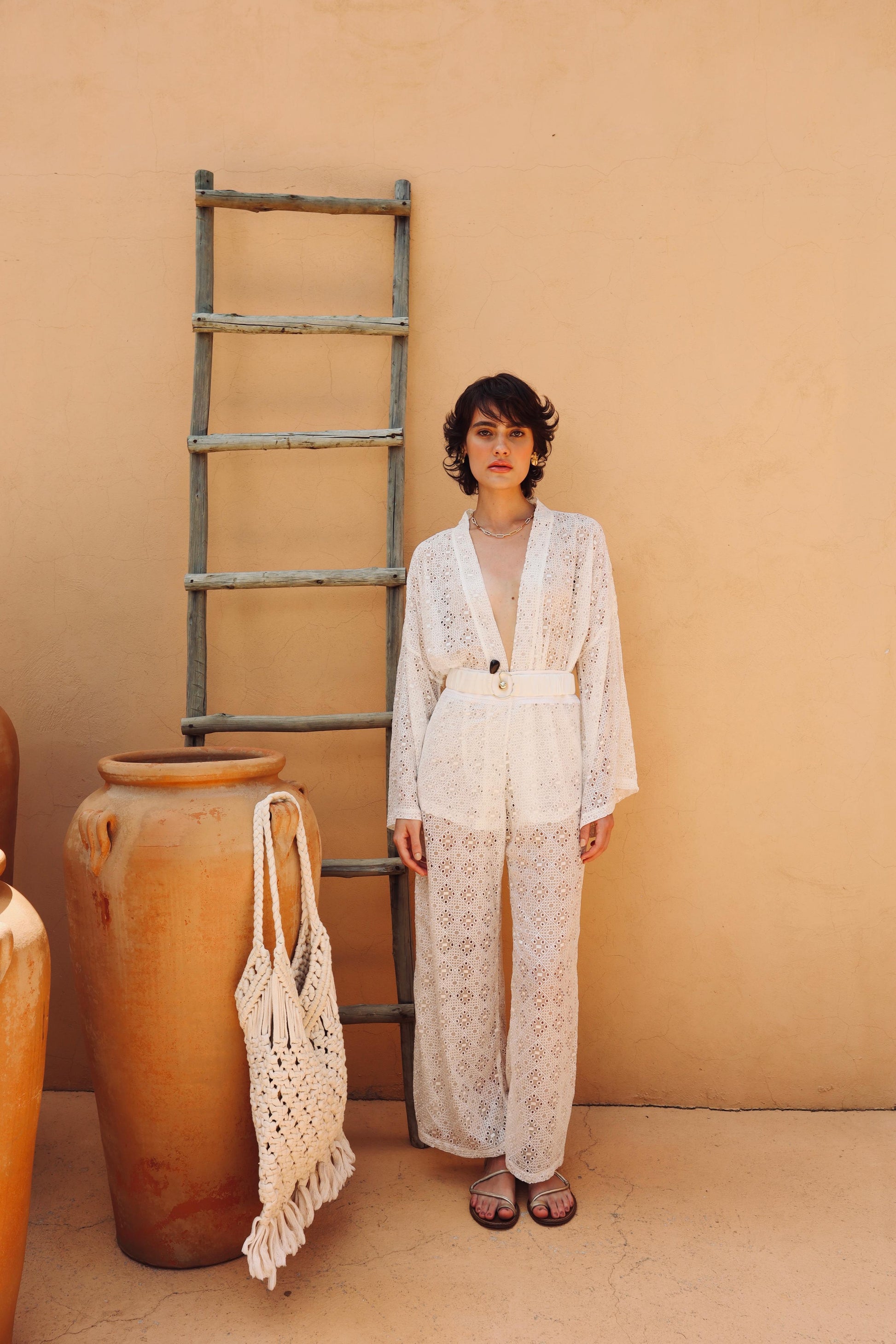 O Conjunto Sicília reúne sofisticação e estilo, composto por calça wide leg e kimono em renda de seda pura nas cores off white e preto. Acompanha cinto elástico com detalhe em aço inoxidável e uma pedra elegante, adicionando um toque refinado ao visual. Perfeito para quem busca um look distinguido com conforto e design contemporâneo.